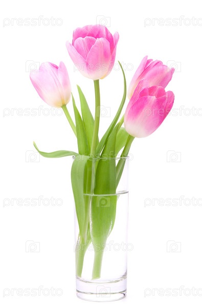 Букет розовых тюльпанов в вазе, изолированный на белом фоне