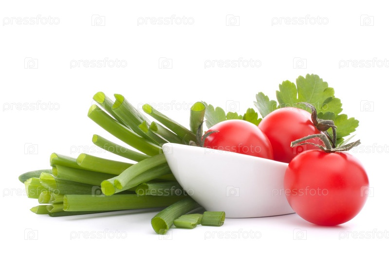 Зеленый лук и помидоры черри в миске