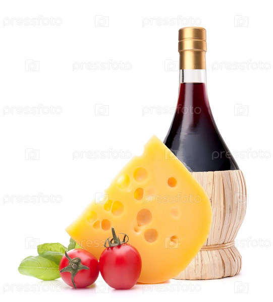 Бутылка красного вина, сыр и помидоры