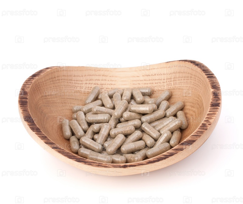 Травяные капсулы в деревянной тарелке. Концепция альтернативной медицины