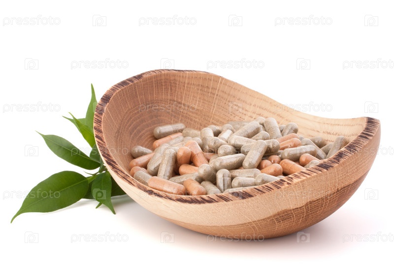 Травяные капсулы в деревянной тарелке. Концепция альтернативной медицины