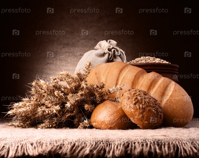 Хлеб, мешок муки и колосья