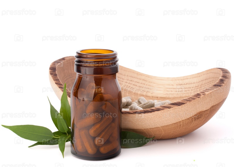 Травяные капсулы в коричневой стеклянной бутылке. Концепция альтернативной медицины