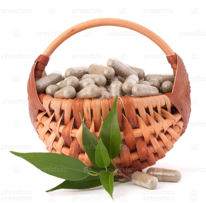 Травяные капсулы в плетеной корзине. Концепция альтернативной медицины