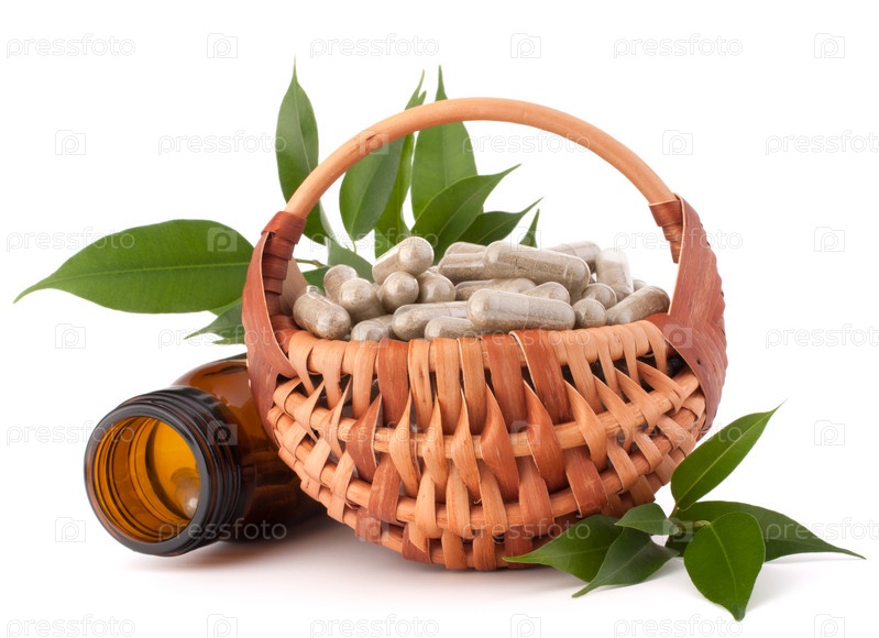 Травяные капсулы в плетеной корзине. Концепция альтернативной медицины