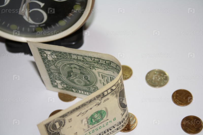 Будильник, долларовая банкнота и русские монетки на белом фоне