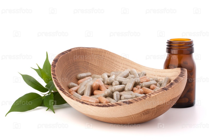 Травяные капсулы в деревянной тарелке. Концепция альтернативной медицины