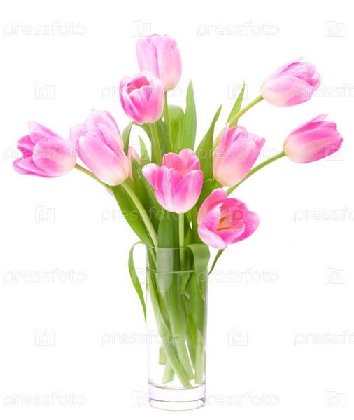 Букет розовых тюльпанов в вазе, изолированный на белом фоне