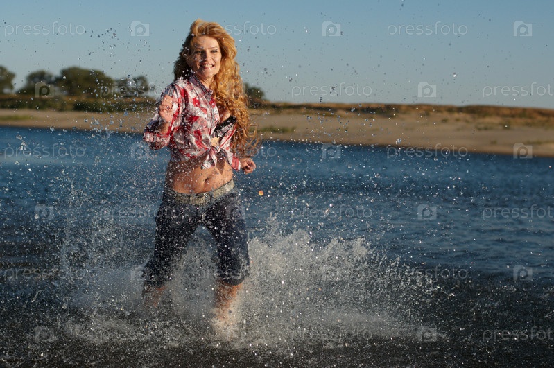 Молодая красивая девушка, бегущая по воде