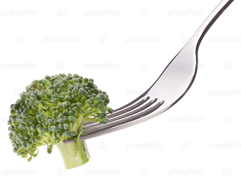 Брокколи на вилке, изолировано на белом фоне