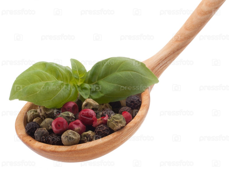 Смесь перца в деревянной ложке, изолированная на белом фоне