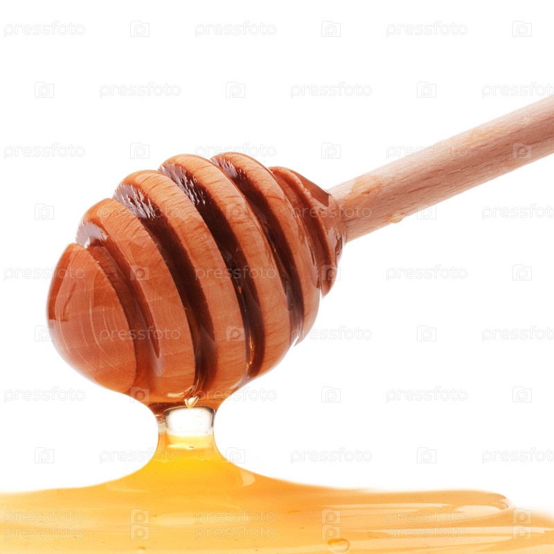 Мед капает с деревянного ковша, изолировано на белом фоне