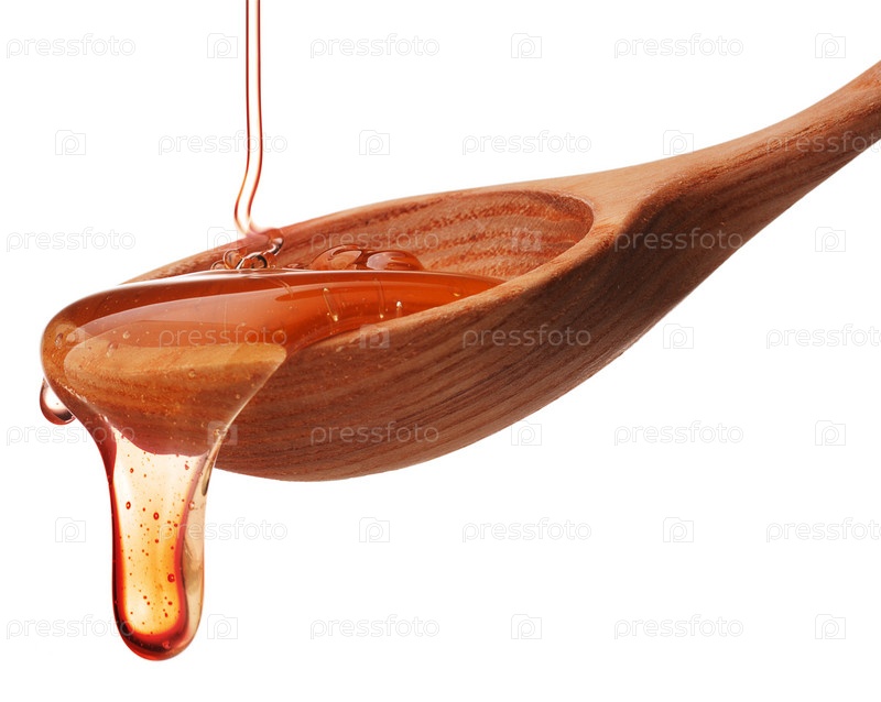 Мед капает с деревянного ковша, изолированный на белом фоне