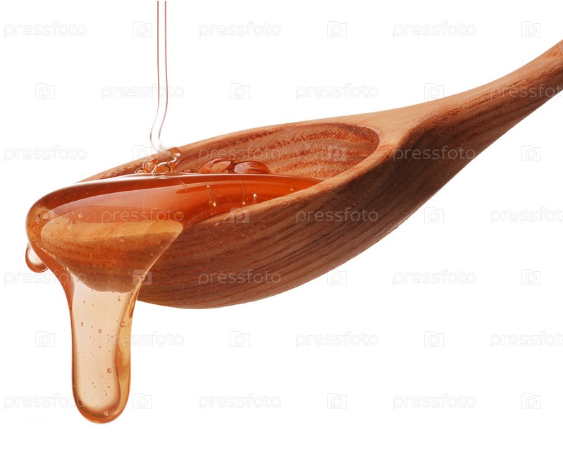 Мед капает с деревянной ложки, изолированный на белом фоне