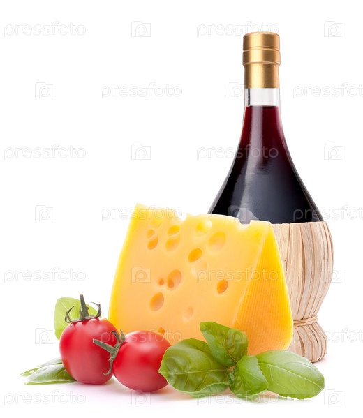 Бутылка красного вина, сыр и помидоры
