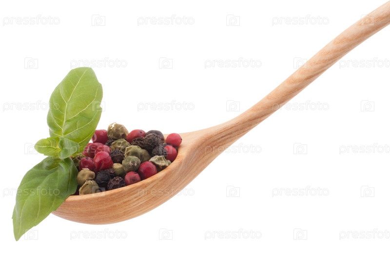 Смесь приправ в деревянной ложке, изолированные на белом фоне