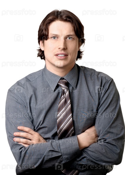 Успешный молодой предприниматель со скрещенными руками, на белом фоне