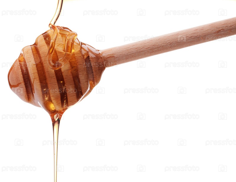 Мед капает с деревянного ковша, изолировано на белом фоне