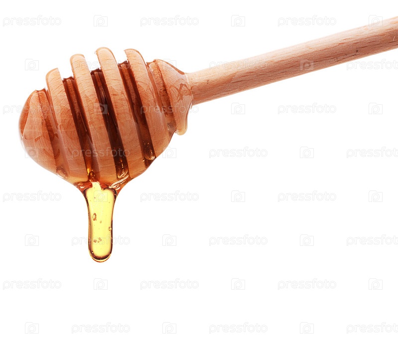 Мед капает из деревянной ложки, изолированный на белом фоне
