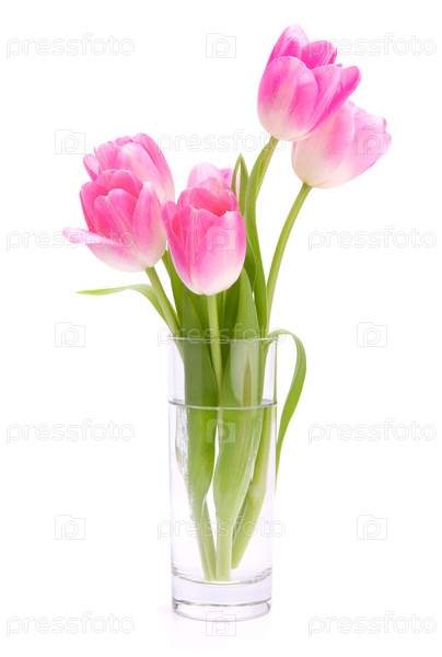 Букет розовых тюльпанов в вазе, изолированный на белом фоне