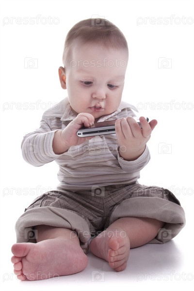 Младенец, играющий с телефоном на белом фоне
