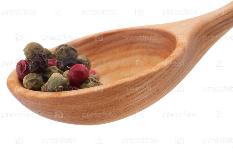 Перец в деревянной ложке, изолированный на белом фоне