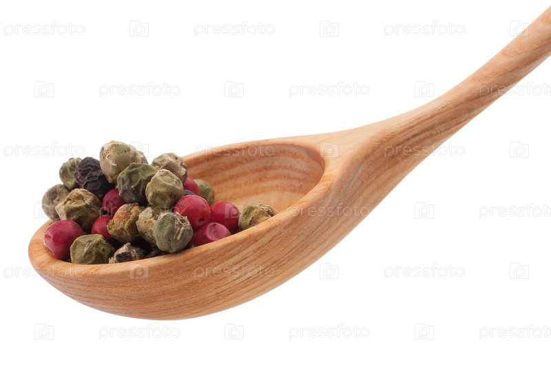 Перец в деревянной ложке, изолированный на белом фоне