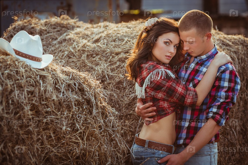 Пара обнимается возле сена