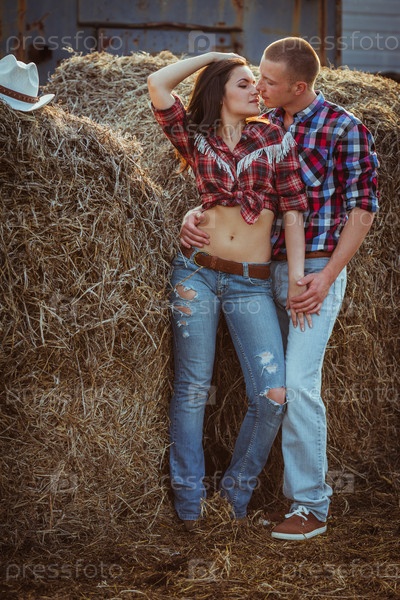 Пара обнимается возле сена