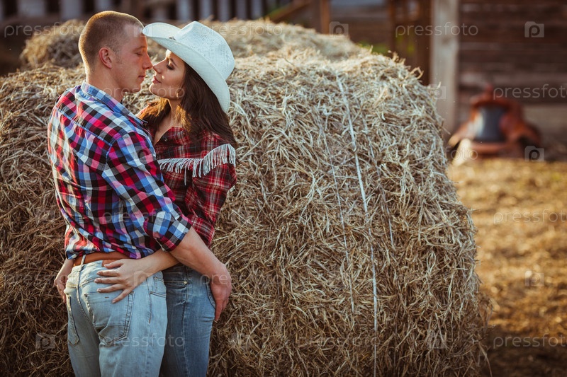 Пара обнимается возле сена
