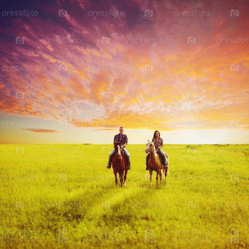 Пара едет верхом на лошадях через поле