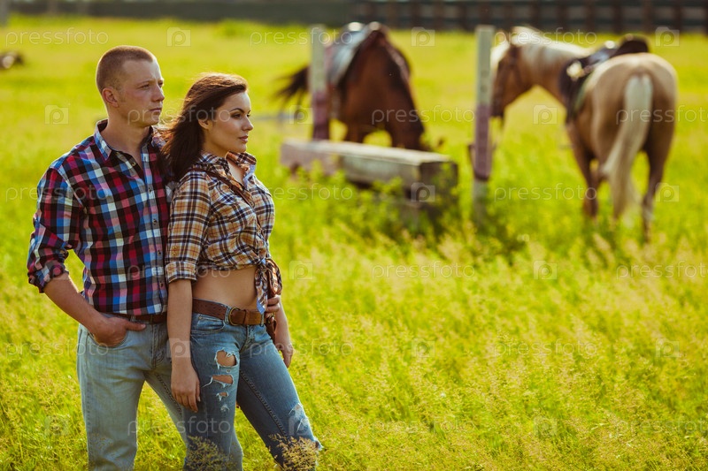 Пара стоит с лошадьми на ферме