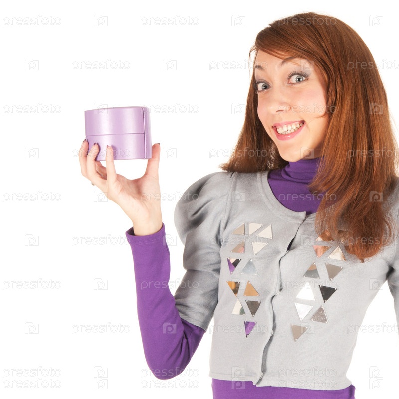 Улыбающаяся девушка с фиолетовой баночкой на белом фоне