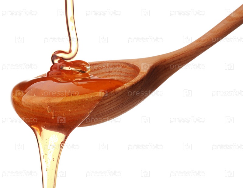 Мед капает с деревянного ковша, изолированный на белом фоне
