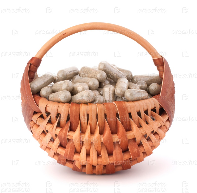 Травяные капсулы в корзине. Концепция нгетрадиционной медицины