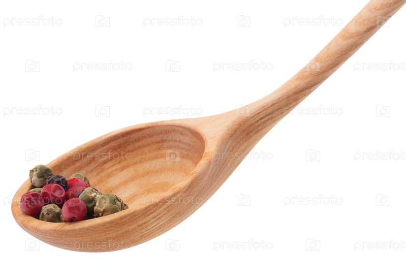Перец в деревянной ложке, изолированный на белом фоне