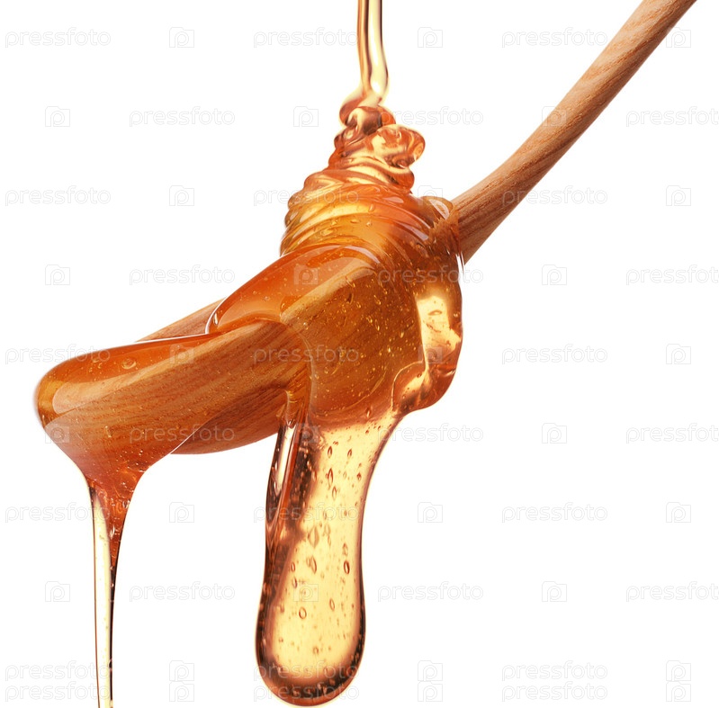 Мед капает с деревянного ковша, изолированный на белом фоне