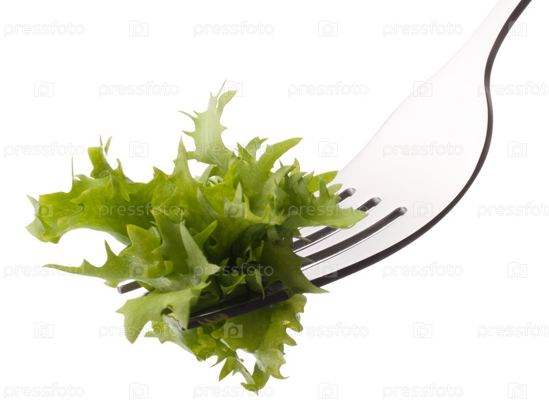 Свежий салат на вилке, изолированный на белом фоне. Здоровое питание