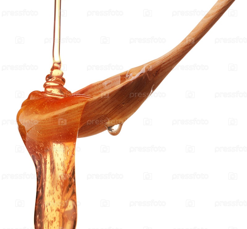 Мед капает с деревянного ковша, изолированный на белом фоне