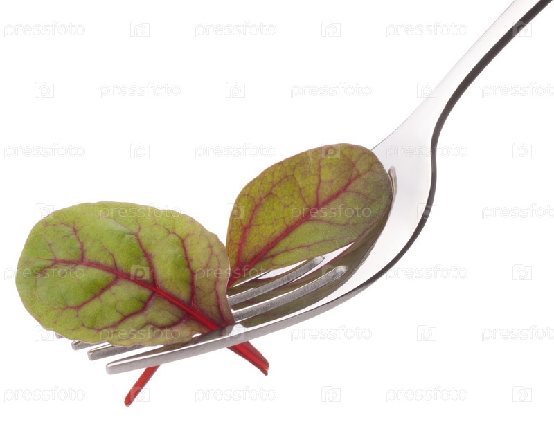 Свежий салат мангольд на вилке, изолированный на белом фоне