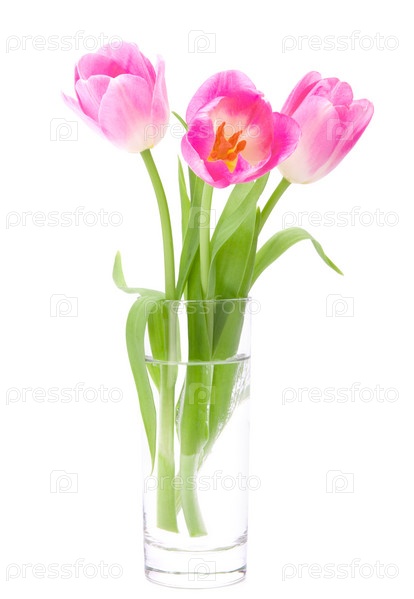Букет розовых тюльпанов в вазе, изолированный на белом фоне