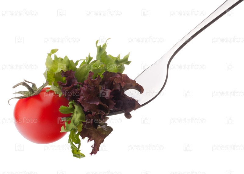 Свежий салат и помидор черри на вилке, изолированные на белом фоне