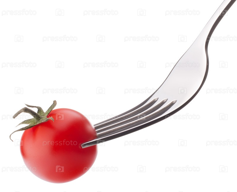 Помидор черри на вилке, изолированный на белом фоне
