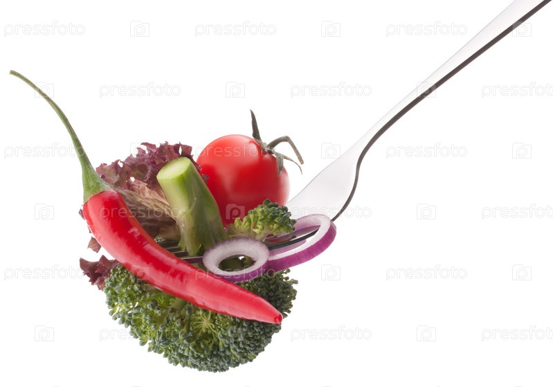 Свежие сырые овощи на вилке, изолированные на белом фоне