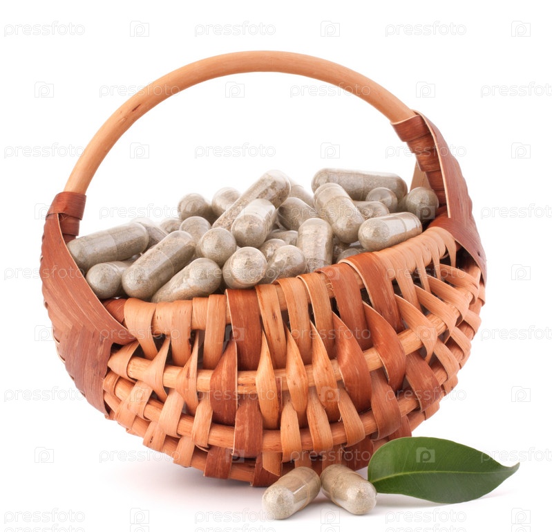 Травяные капсулы в плетеной корзине. Концепция альтернативной медицины