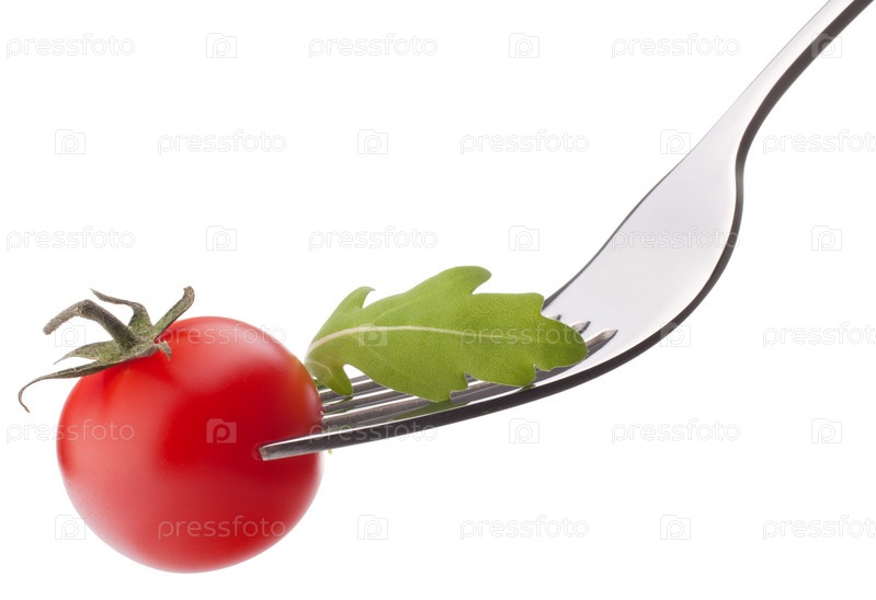Свежая руккола и помидор черри на вилке, изолированные на белом фоне