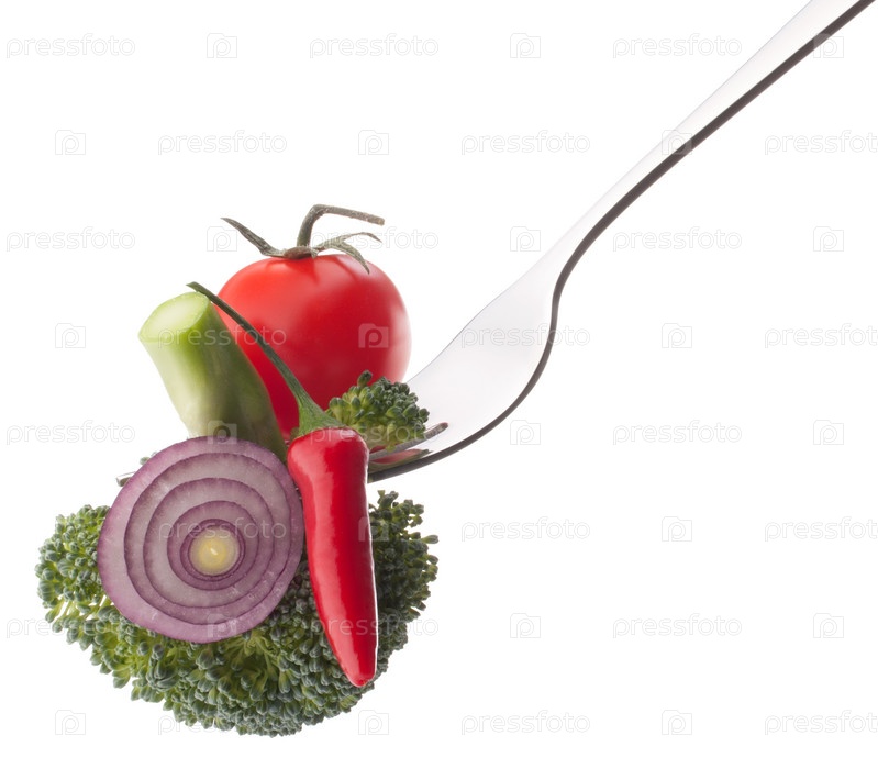 Свежие сырые овощи на вилке, изолированные на белом фоне. Здоровое питание