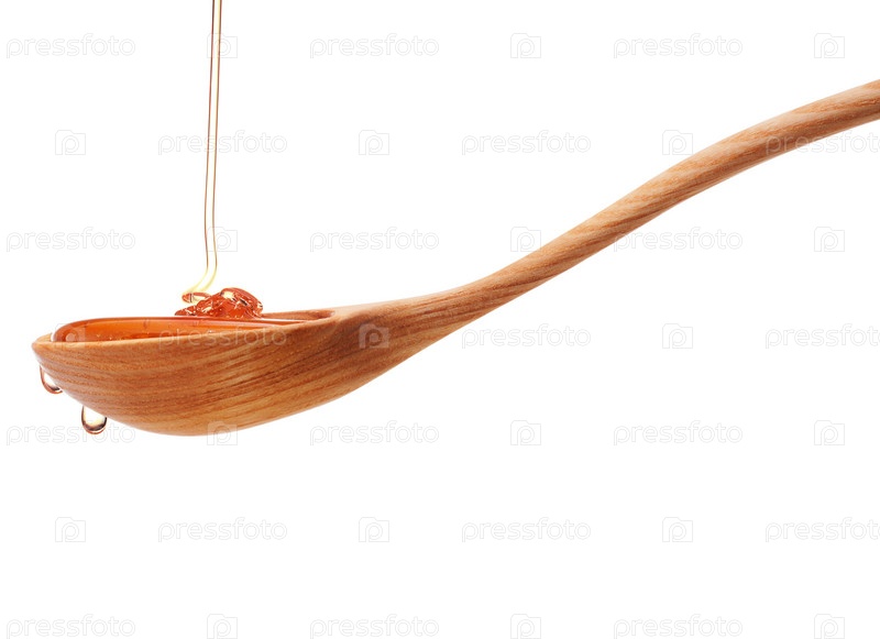 Мед капает с деревянной ложки, изолированный на белом фоне