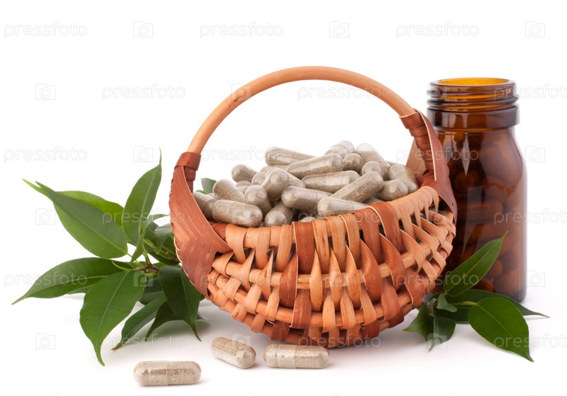 Травяные капсулы в плетеной корзине. Концепция альтернативной медицины