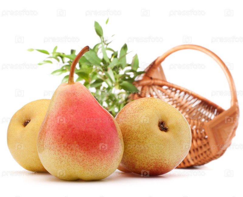 Груши и плетеная корзина, изолированные на белом фоне. Осенний урожай